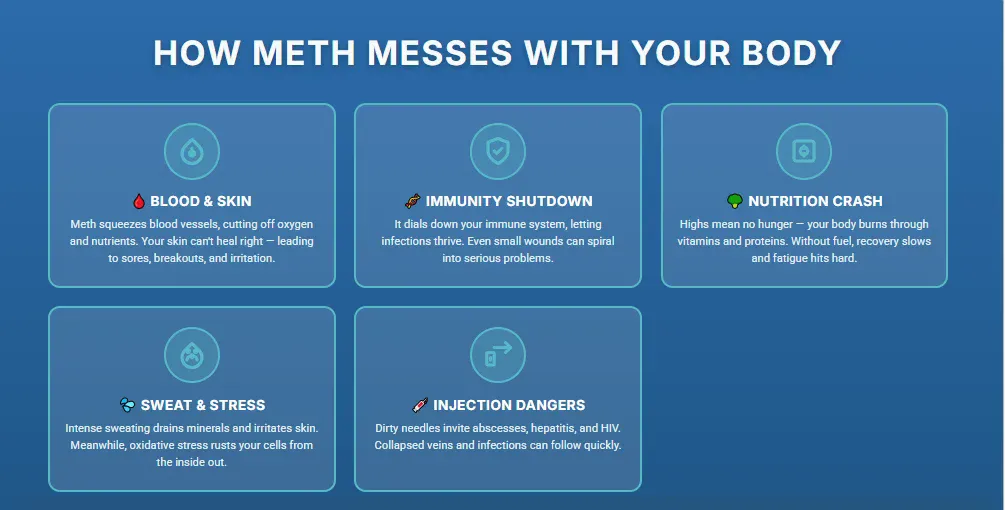 The drug squeezes blood flow, starves skin of fixes, and dials down immunity, letting infections thrive. Sweat from highs irritates, poor eats strip vitamins, and if you’re shooting up, Dirty needles seal the deal with abscesses. Oxidative stress rusts cells inside out brutal combo. Your body’s yelling for a timeout; listen, and it rebounds.